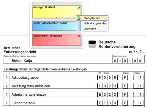 Rendered therapies or diagnostic procedures can be marked visually in the schedule control or using mobile Android-based devices. Cancelled dates or no-show events with missing patients with or without excuse may be documented as well.